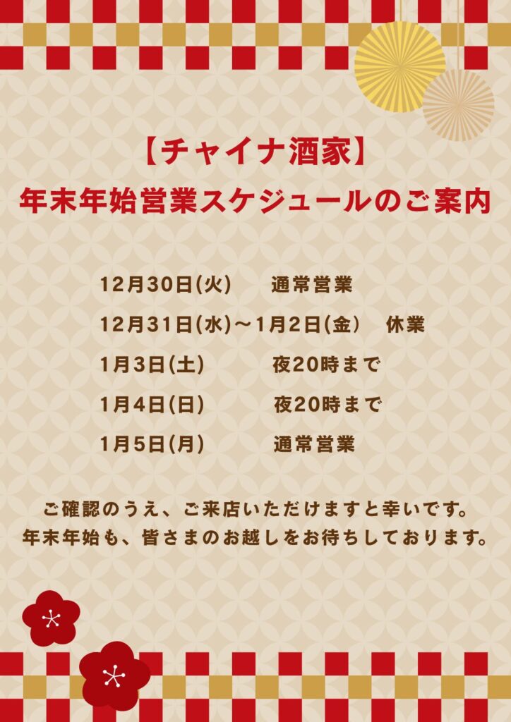 チャイナ酒家 年末年始営業スケジュールのご案内