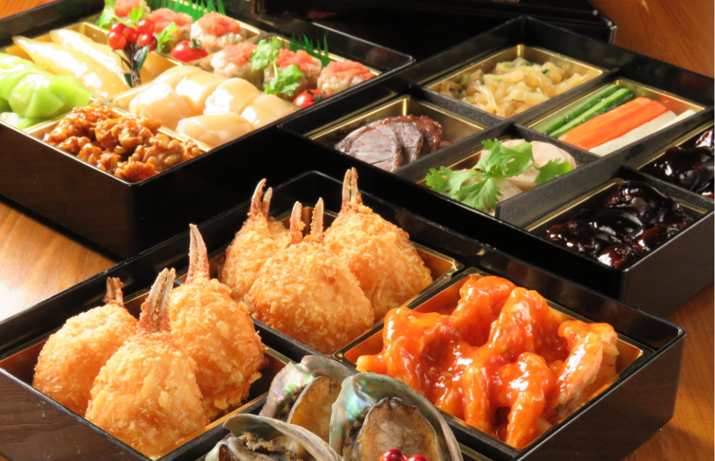 活き和わびの柔らか煮/大正海老のチリソース/ズワイ蟹爪フライ/唐苑名物黒酢酢豚(パン付き)/大粒貝柱醤油煮/数の子紹興酒漬け/牛すね肉の香り煮/鶏肉のジャスミン風煮/とびっ子肉焼売/クルミの飴炊き/さっぱり中華風漬物/くらげの冷製/翡翠海老餃子